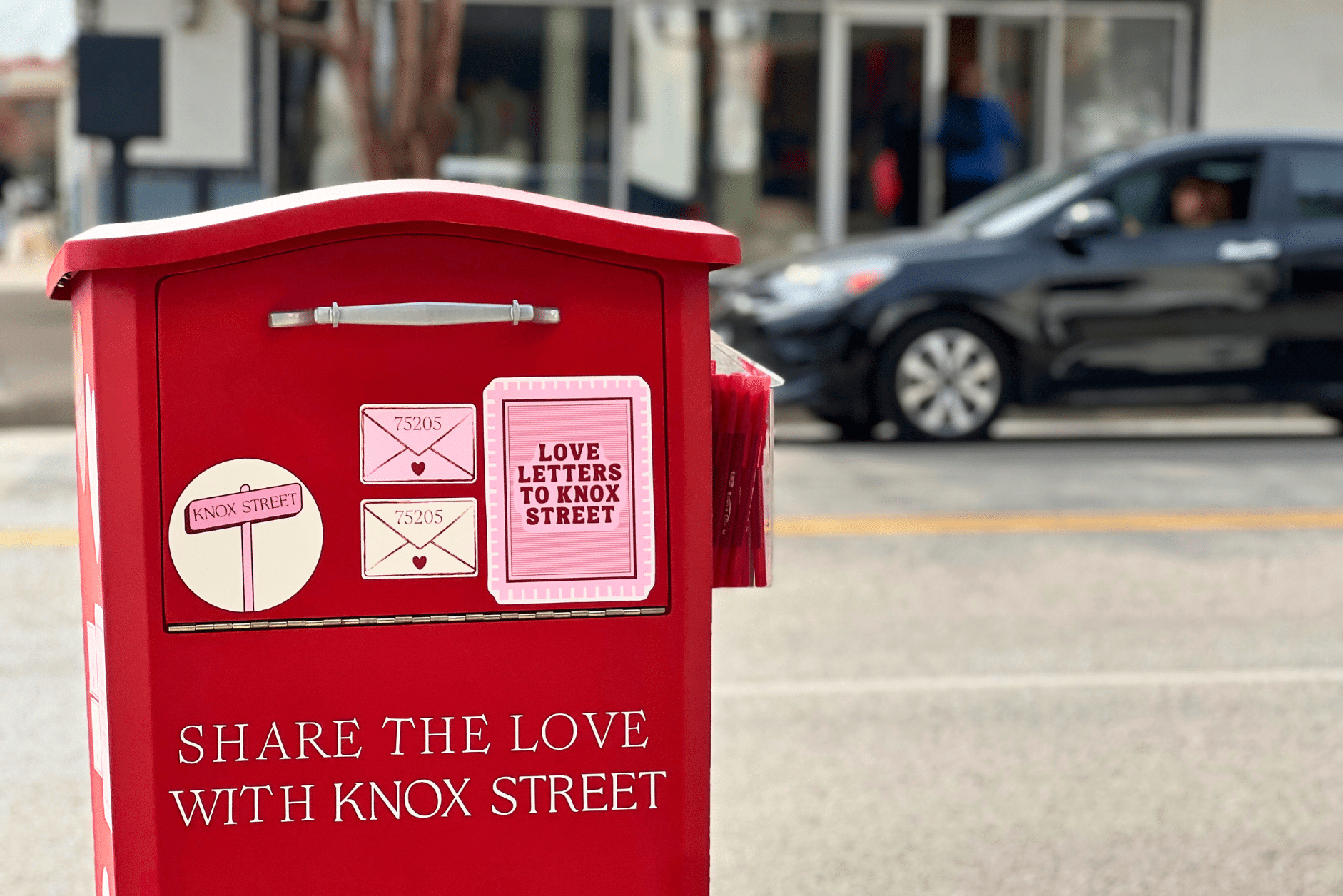 Share the love, and your thoughts, with Knox Street in celebration of Valentine’s Day. Find one of Knox Street’s custom red mailboxes placed on the corner of Knox Street & Cole Avenue and near lululemon, and “mail” a provided Knox Street postcard to be entered to win the “Share the Love” package – valued at $500.
